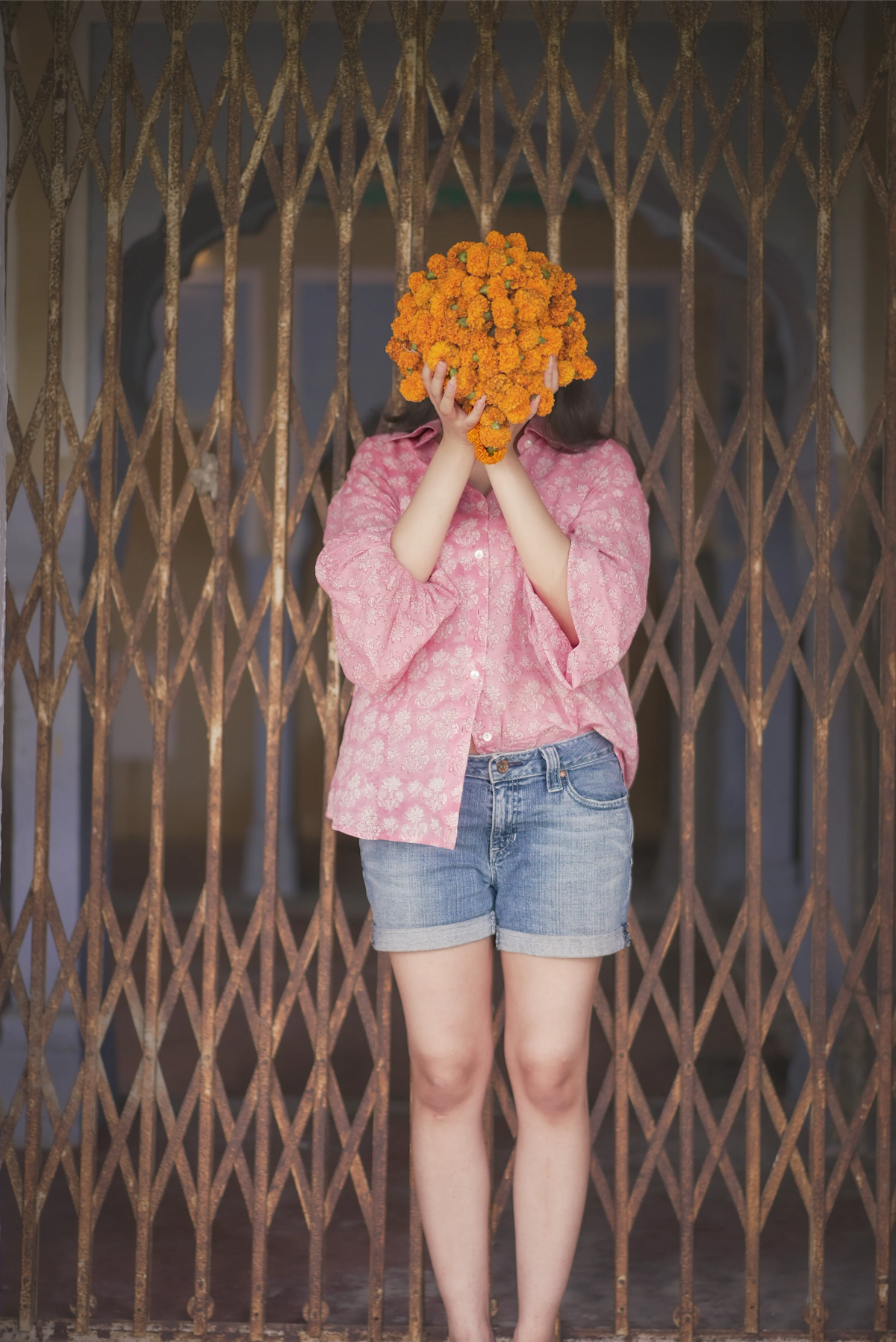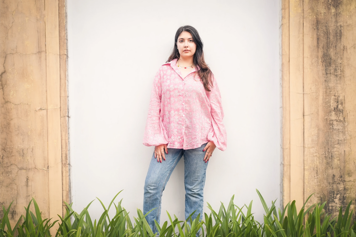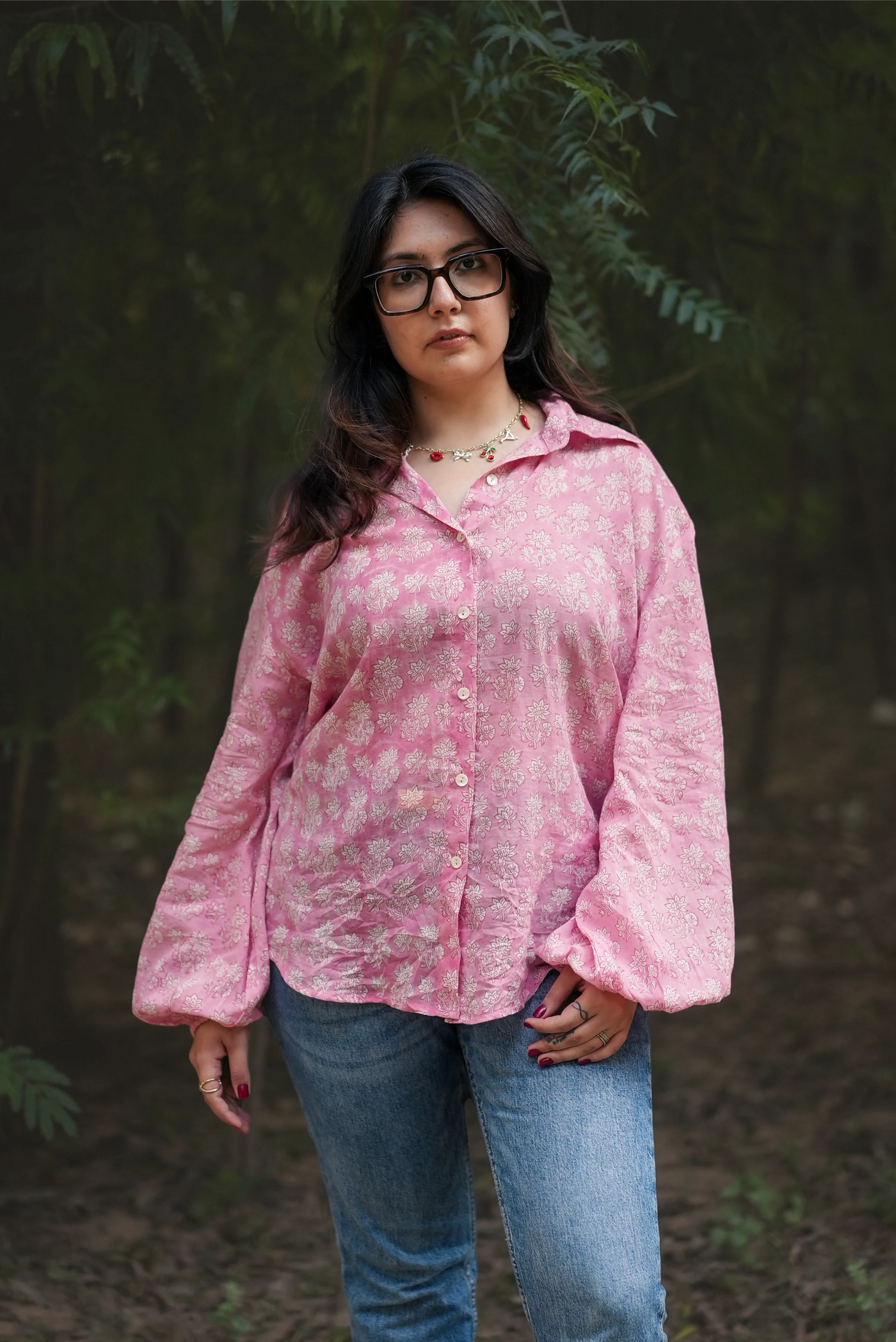 Muslin Bloom, where comfort turns into poetry. Woven from air and ease, this pink hand-block printed shirt drifts like a petal in spring wind. Its billowing sleeves echo laughter and light, gentle and free. A bloom you wear, soft against skin, softer in spirit.