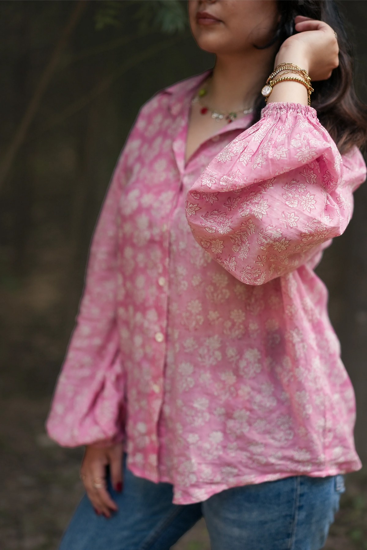Detail: Pink hand-block printed shirt with billowing sleeves.