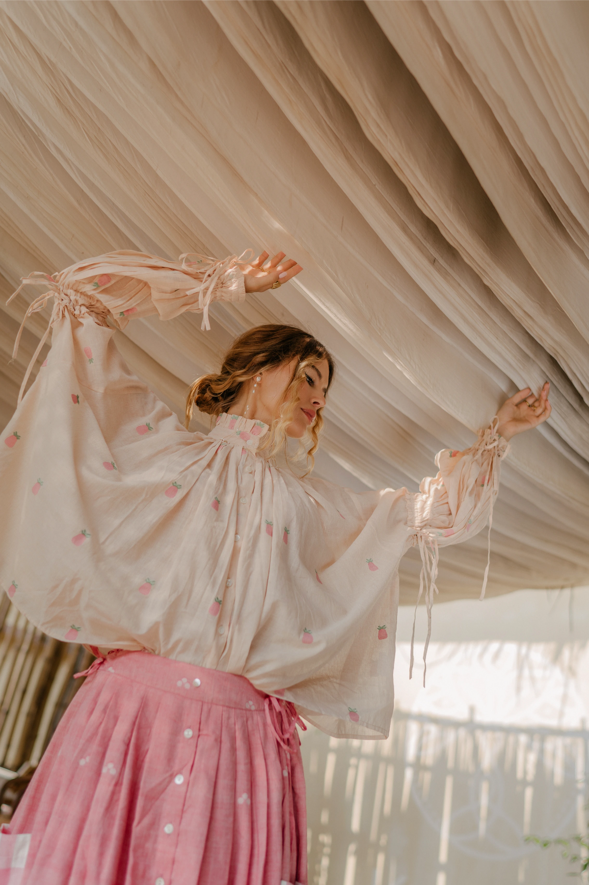 A Jamdani cotton button-front blouse featuring a pleated high collar. The pineapple motifs and wispy texture will make you reach for this future heirloom again and again.