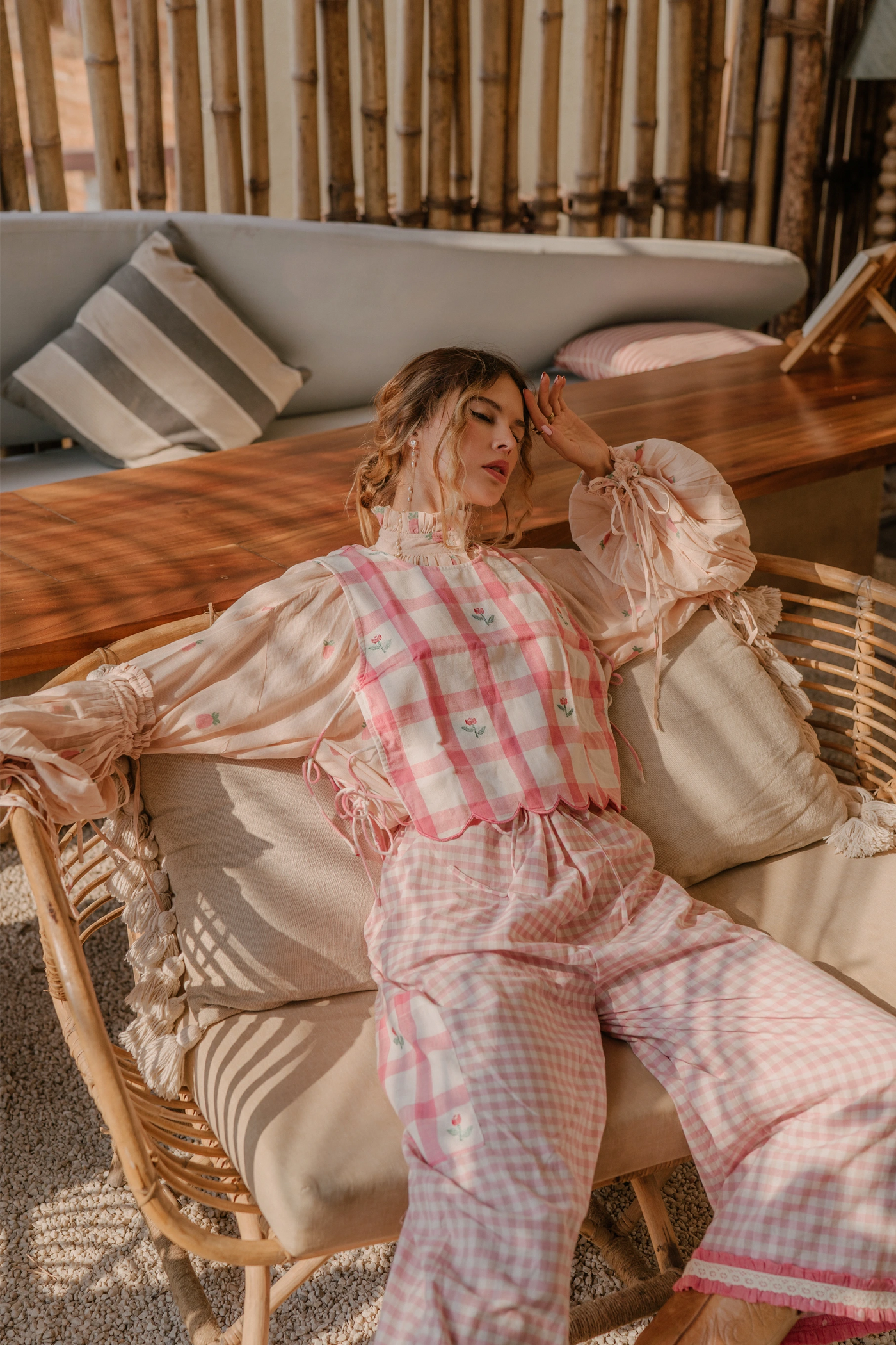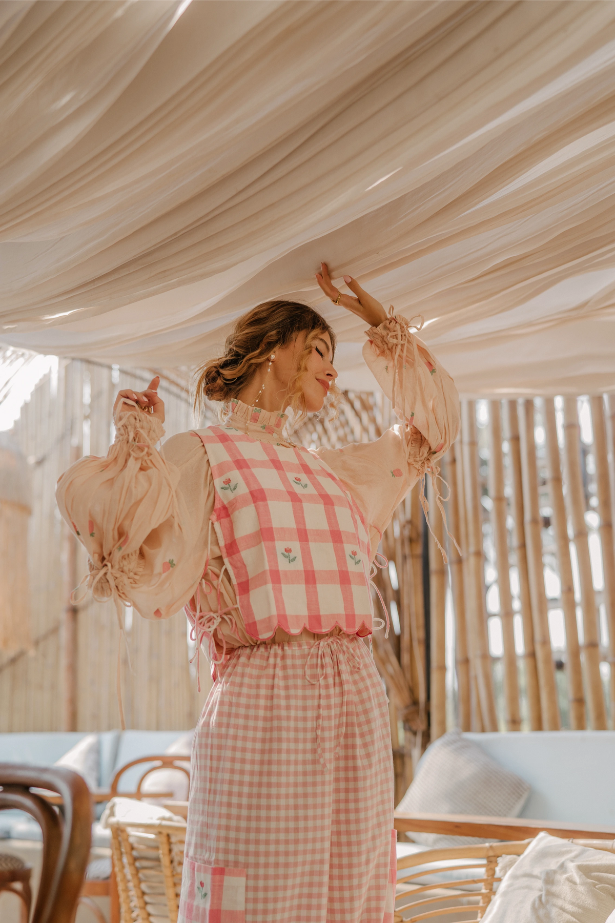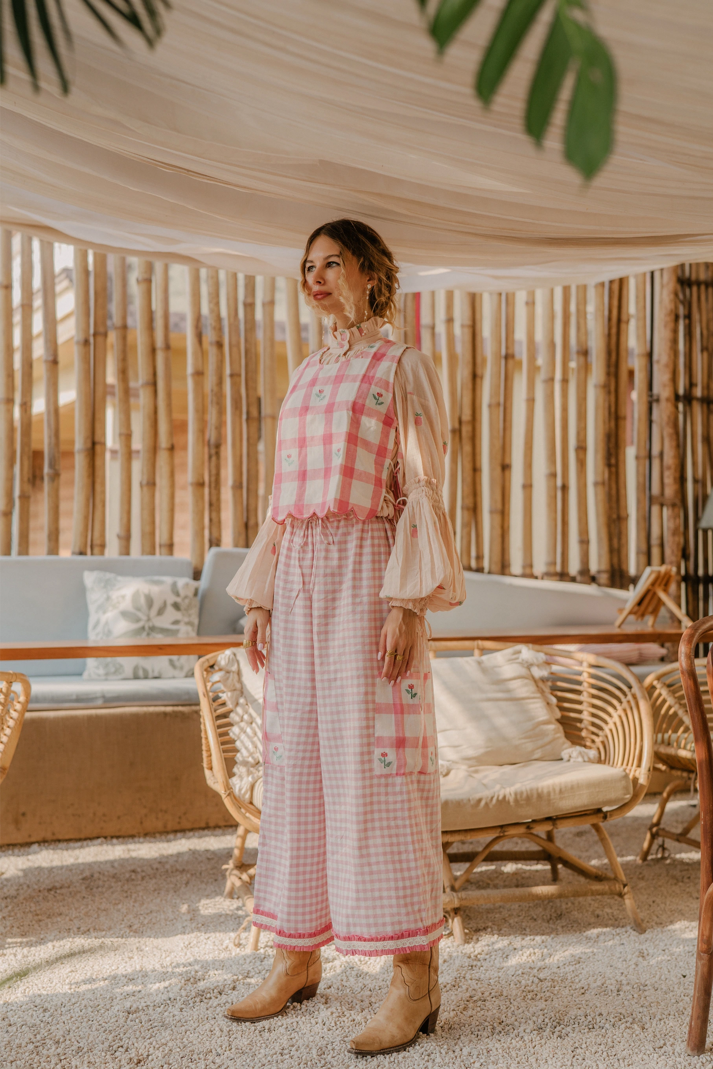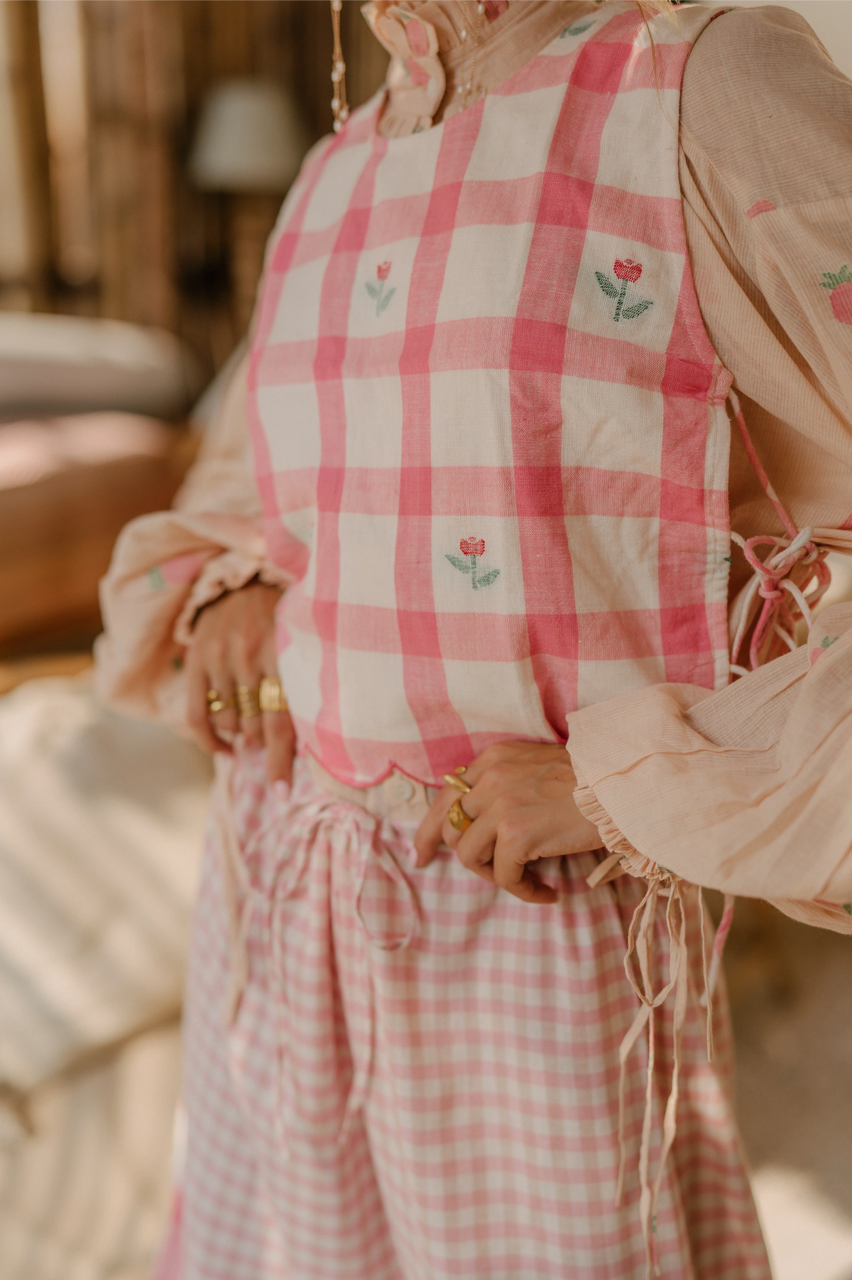 Bib style vest with side ties, made out of a gorgeous check Jamdani with floral motifs.