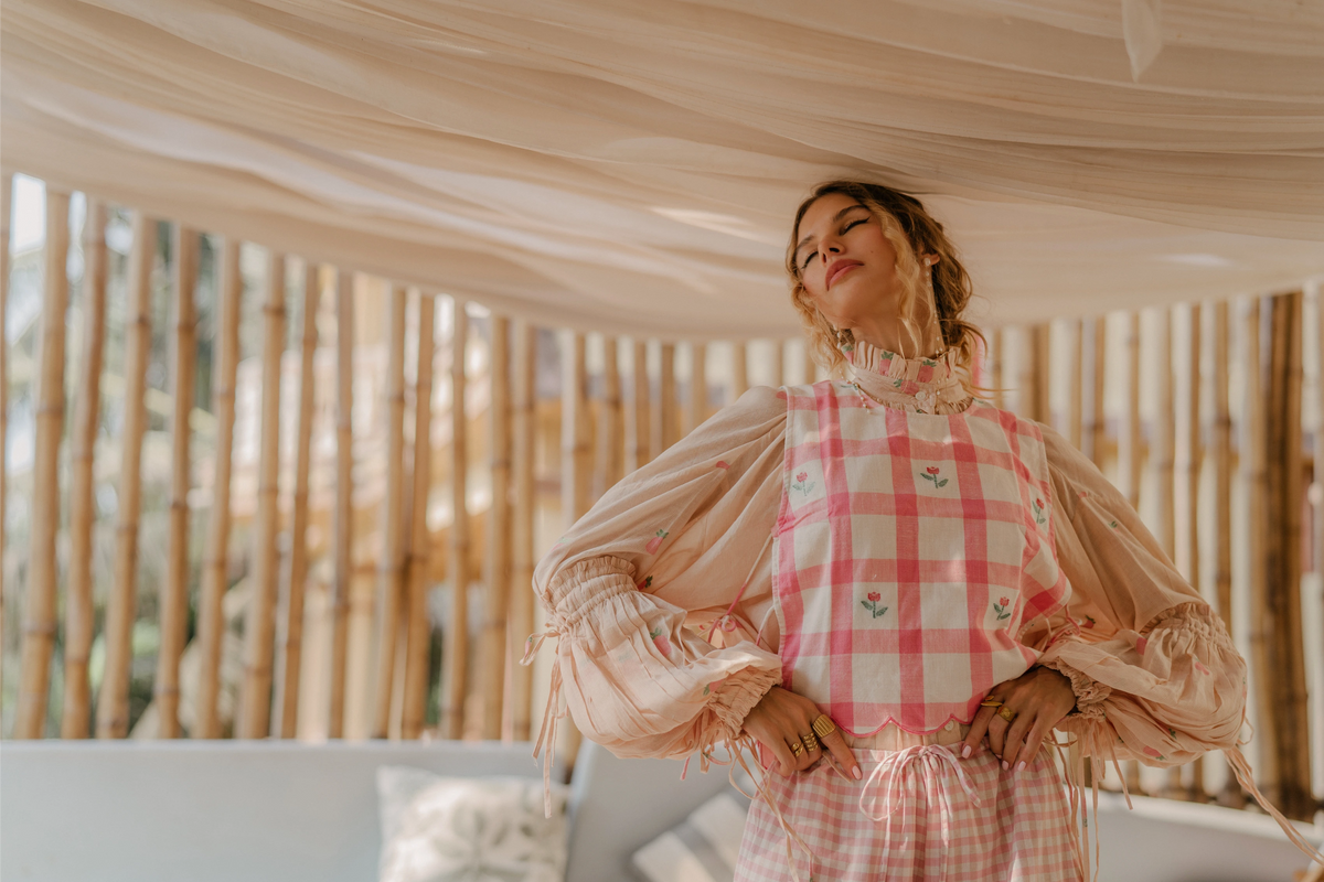 Details: Bib-style vest, side ties, check Jamdani with floral motifs.