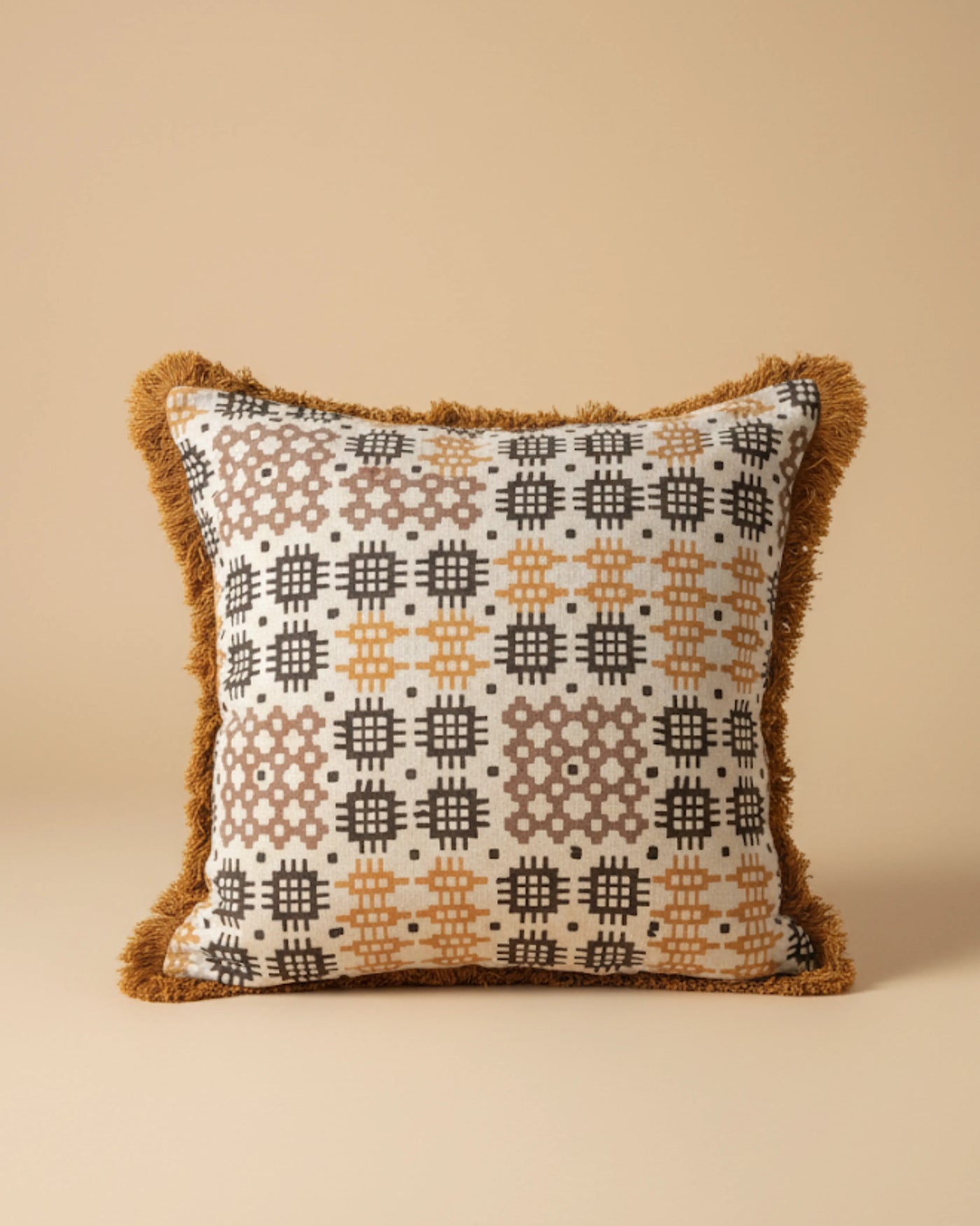 We've reimagined the traditional Welsh weave technique through the art of hand block printing, using high-quality Cotton Slub fabric. Our products are crafted with Azo-free vegetable dyes, such as Madder, ensuring a sustainable and eco-friendly approach. The rich maroon, brown, and ecru tones not only make our pieces visually striking but also easy to maintain, making them a perfect addition to any home setting.