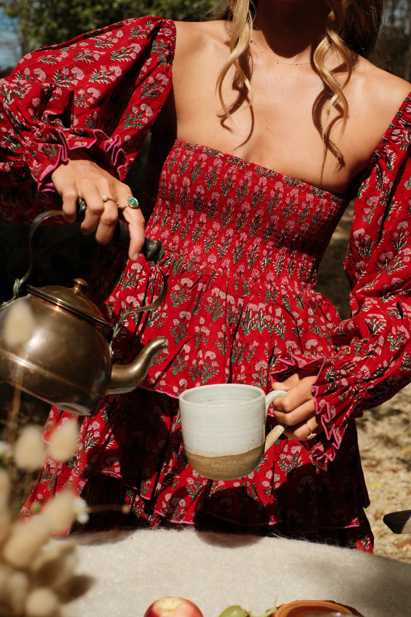 Flirty and full of charm, the Amore Mini is our springtime love letter, a shorter take on our beloved Amore Dress. With tiered ruffles, puffed sleeves, a cinched bodice, and contrast pico detailing, it’s made to move with joy. The neckline can be worn on or off the shoulder, shifting effortlessly from sunny afternoon playfulness to romantic twilight wanderings.