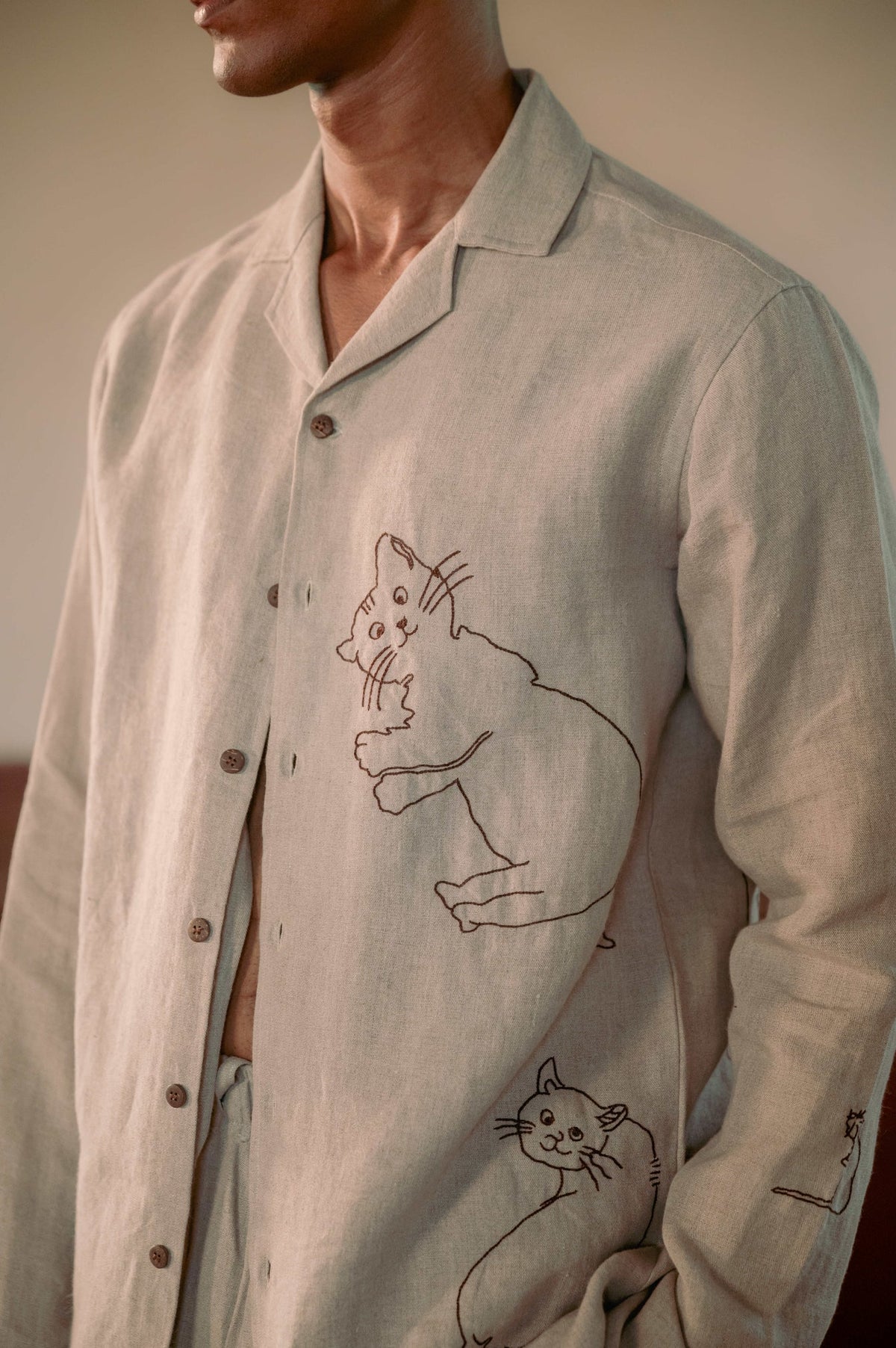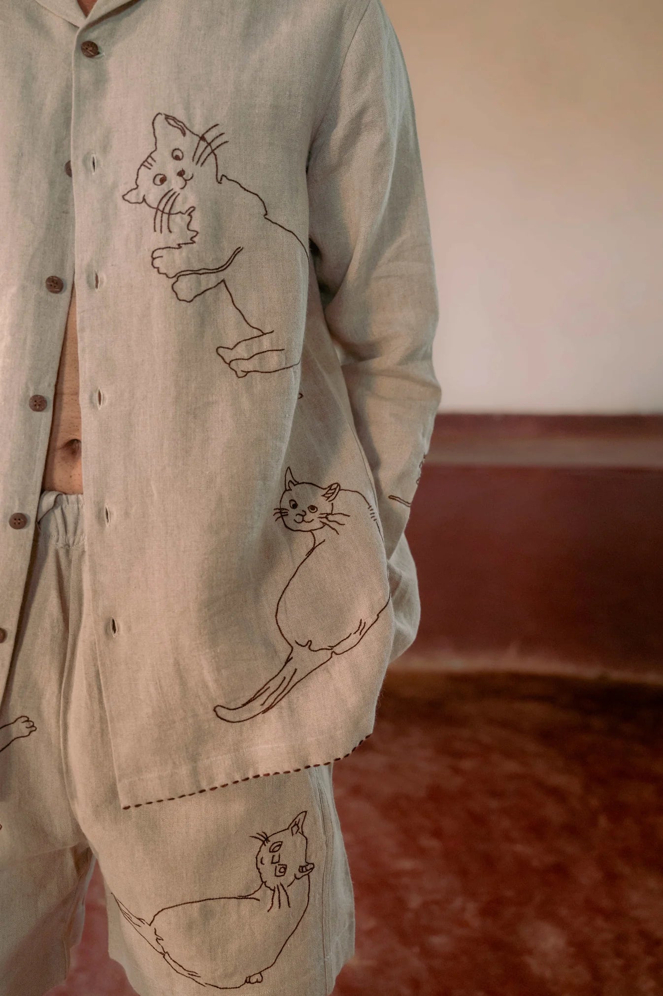 The design is a celebration of unhurried leisure, inspired by the simple, restful cycle of a cat's day. The piece is made from luxurious 100% European Linen and features whimsical hand-embroidered cats and mouse details. Hand embroidery is a universal and ancient craft, dating back thousands of years across cultures like China, the Near East, and India. This technique transforms the garment into a unique, hand-crafted work of art, signifying enduring quality and heritage.
