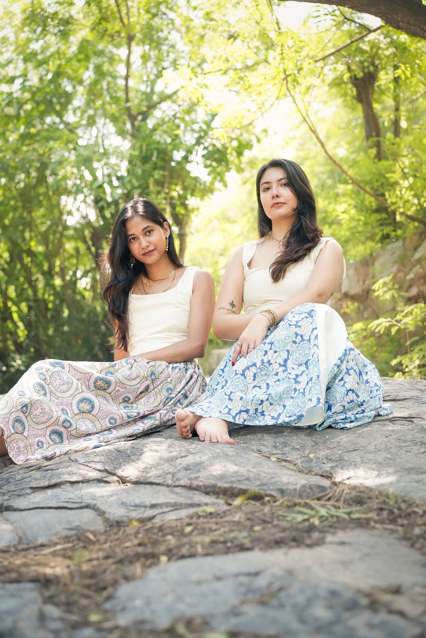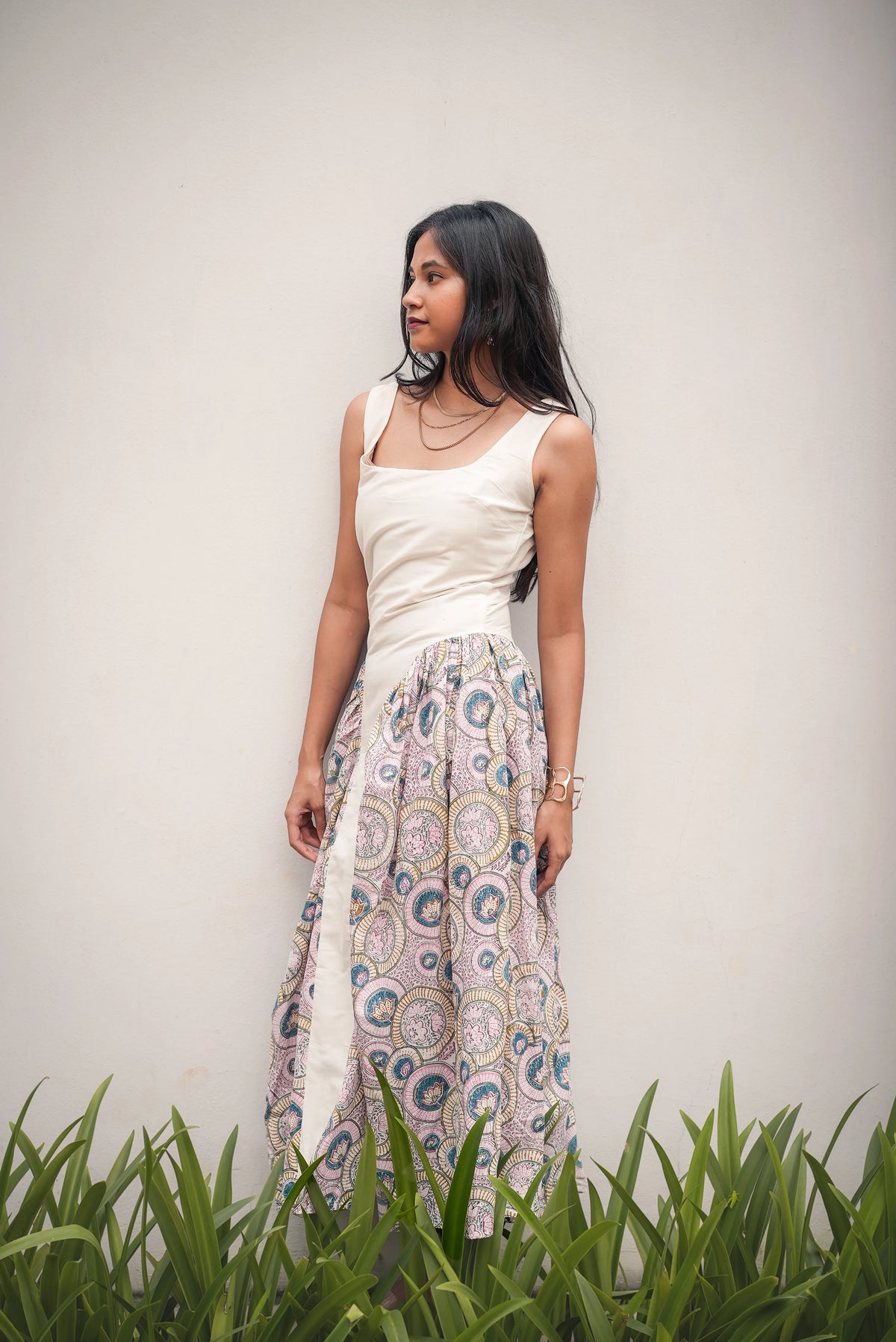 Gul Chandani, "Gul" (to bloom); "Chandani" (moonlight). A dress that feels like quiet poetry, soft ivory cotton framed by panels of block-printed florals. Available in blue (calm gardens) and pink (lotuses blooming under light). Graceful yet grounded, a bloom caught between stillness and shimmer.