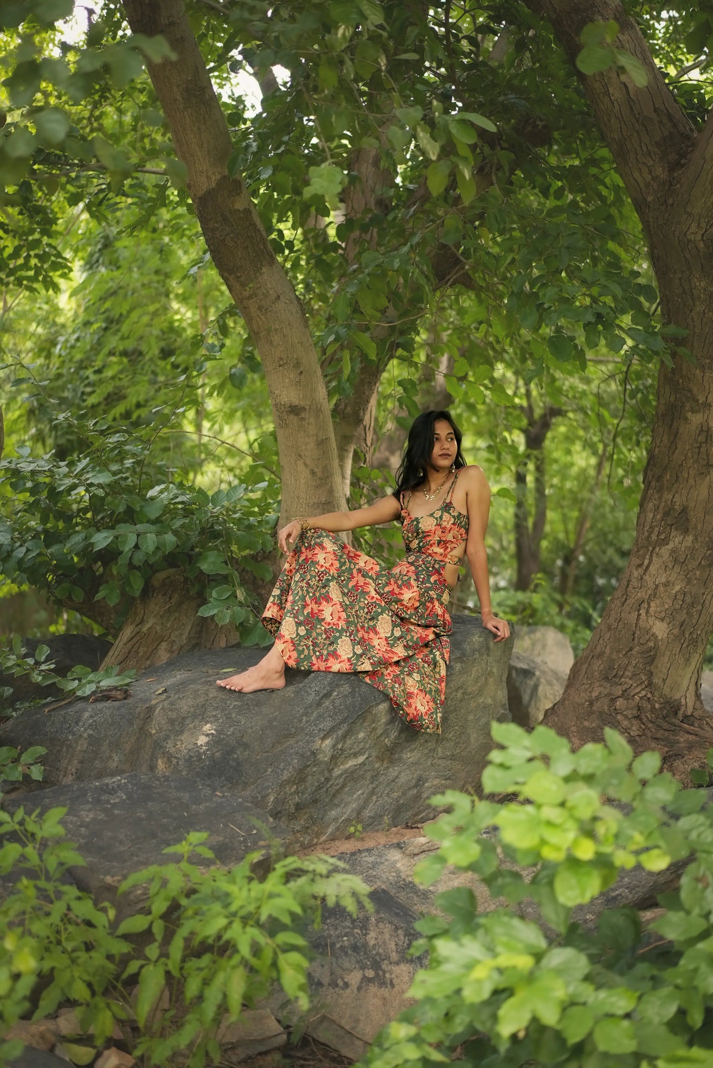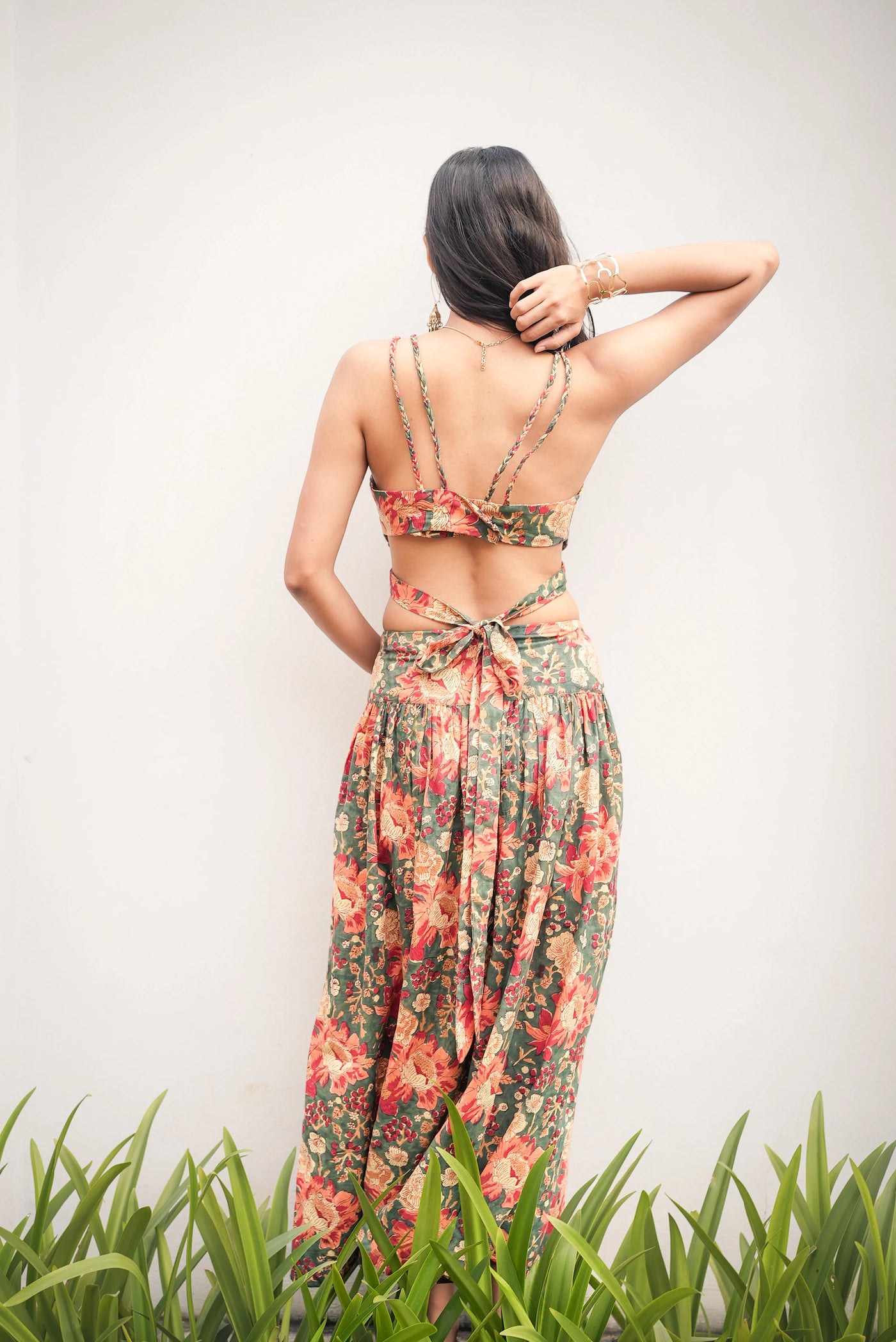 Panna Taara, meaning Emerald Star. A print that feels like wild florals unfurling over deep emerald tones. This back-tie dress moves like a whisper of the tropics, bold and untamed. For days that ask you to shimmer softly, yet stand unmissed.
