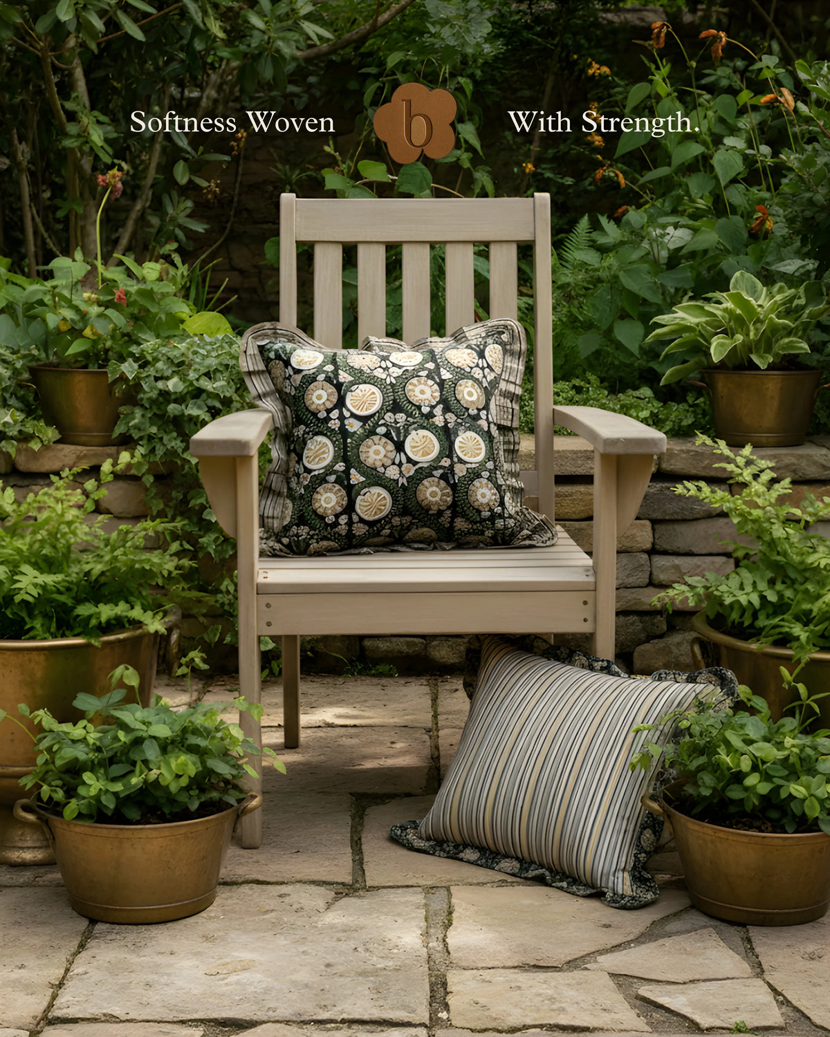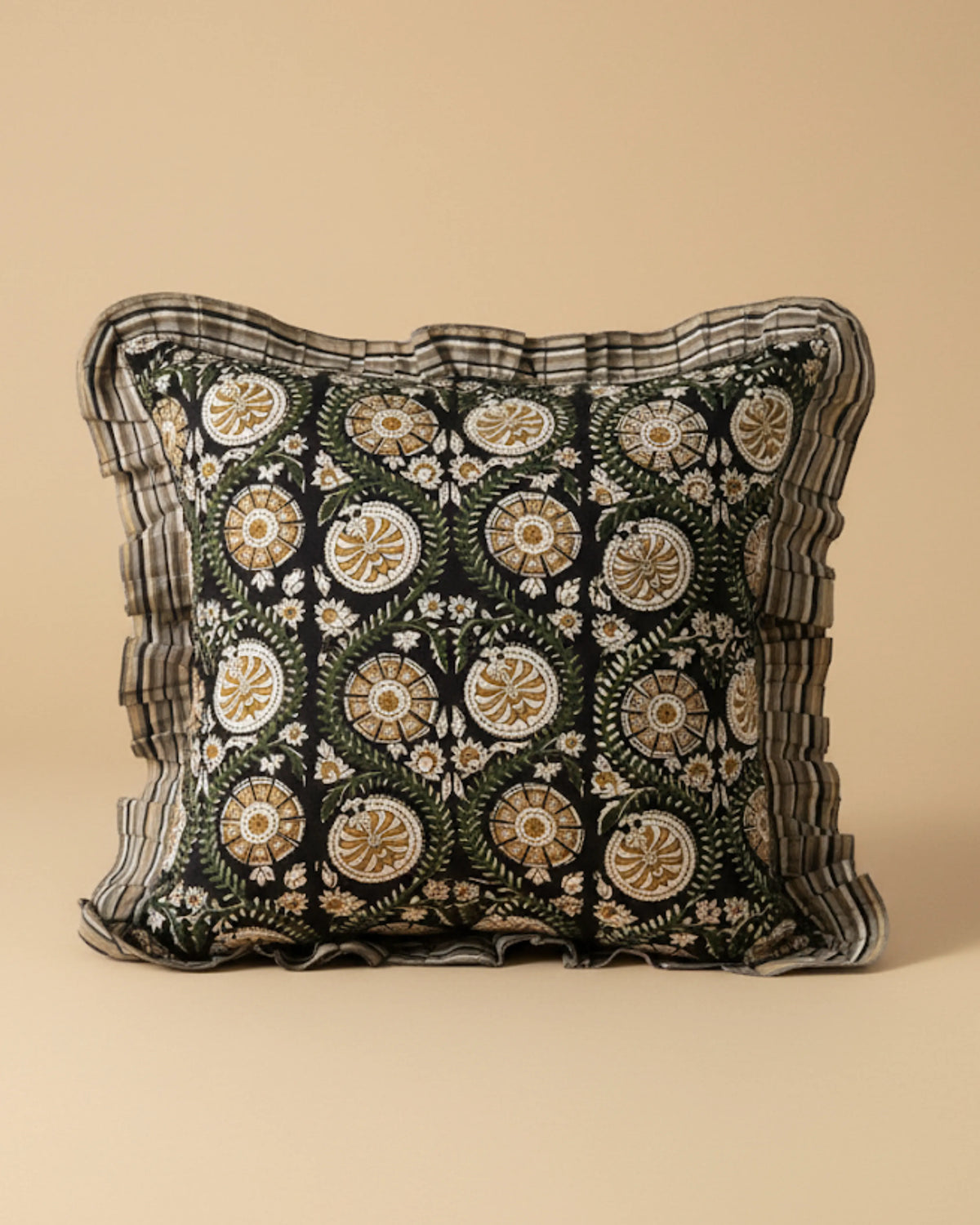 Crafted using the traditional Dabu mud-resist printing technique, each cushion is an ode to slow craft and earthy elegance. The soft frilled edges add a touch of old-world charm, balancing rustic authenticity with refined detailing.  "Made in breathable cotton, this cushion is perfect for bright patios, breezy balconies, or serene indoor corners. Its effortless blend of heritage craft and relaxed elegance makes it a versatile piece for contemporary homes with a soul.
