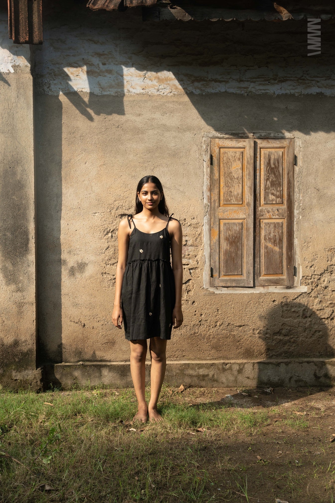 The dress is made from breathable 60 lea linen and features delicate hand-embroidered leaves that add a bespoke touch. Hand embroidery is a universal and ancient craft, dating back thousands of years across cultures like China, the Near East, and India. This technique, which involves decorating fabric with a needle and thread, transforms the garment into a unique, hand-crafted work of art, signifying enduring quality and heritage, complementing the dress's playful, personalized style.