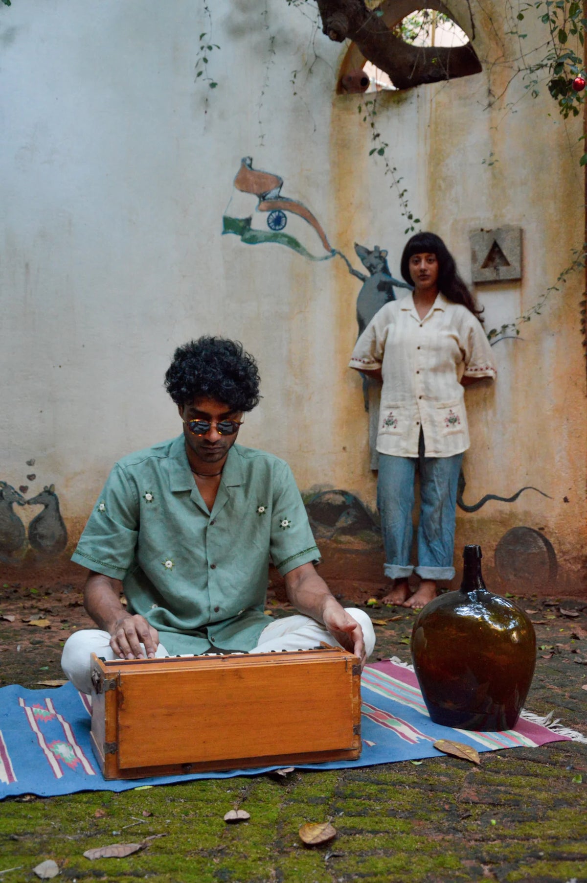 The shirt is inspired by the philosophical search for self: "How do I look? What do I have? Who am I? Why? In search of answers. In search of self." The hidden mirrors symbolize this quest for reflection. The piece is made from 100% European linen and features delicate hand-embroidered flowers with embedded mirrors. Hand embroidery is a universal and ancient craft, dating back thousands of years across cultures, used here to transform the garment into a unique, hand-crafted work of enduring quality and heritage.