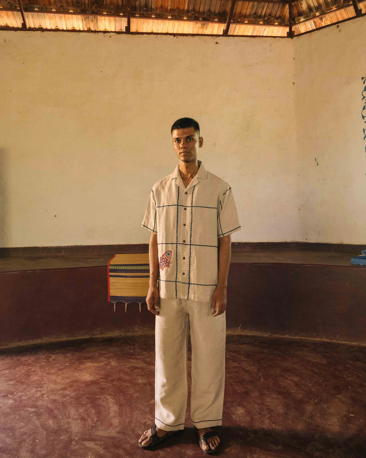 This is a subtle nod to the surprises life has tucked in its patterns. And we, in turn, respond with our own vocabulary of wonder: wow, what, oh no, oh fish. Hand-embroidered and crafted to capture the charm of whimsy. The piece is crafted from breathable 40 lea linen and features unique hand-embroidered fish details. Hand embroidery is a universal and ancient craft, dating back thousands of years across cultures like China, the Near East, and India. This technique transforms the garment into a unique, hand-crafted work of art, signifying enduring quality and heritage.