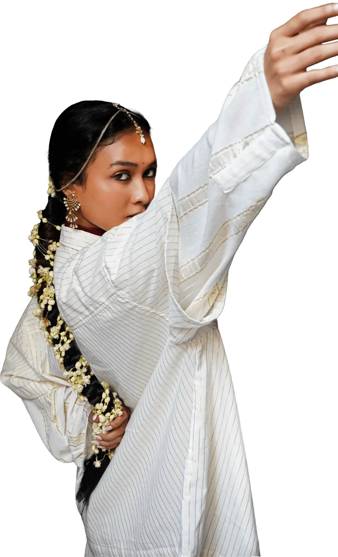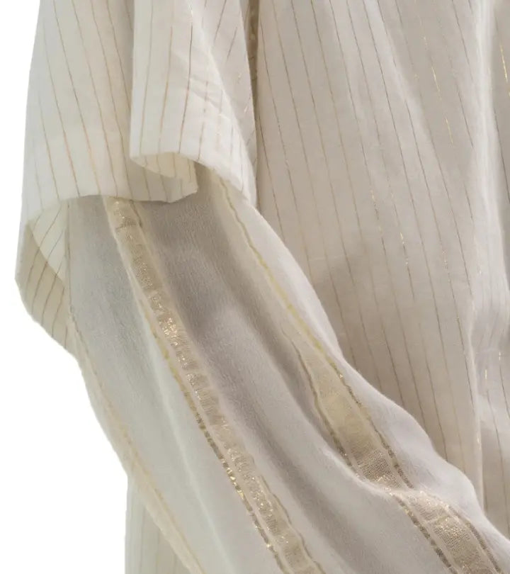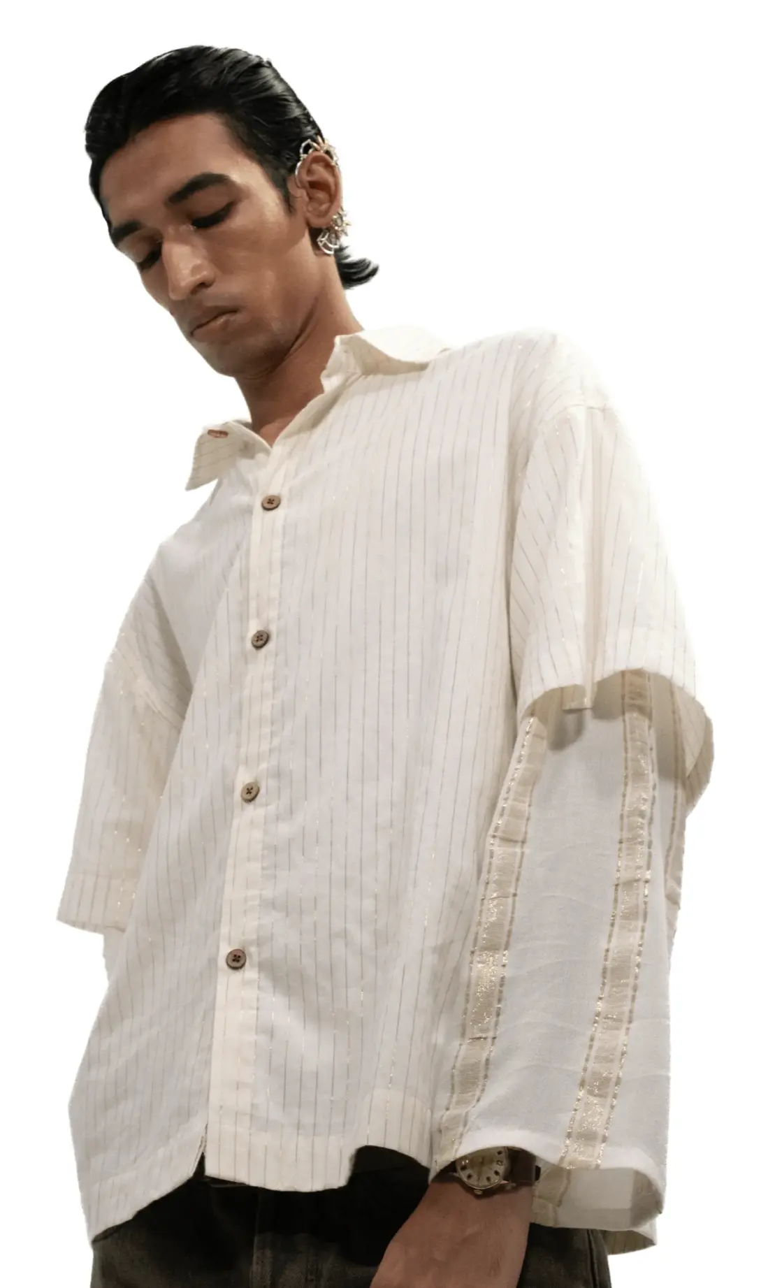 A festive edit shirt featuring a Kasavu-inspired Zari weave. The design includes pinstriping with a unique sleeve-over-sleeve structure. Precision tailoring includes a single-layer lining for perfect weight and fall.