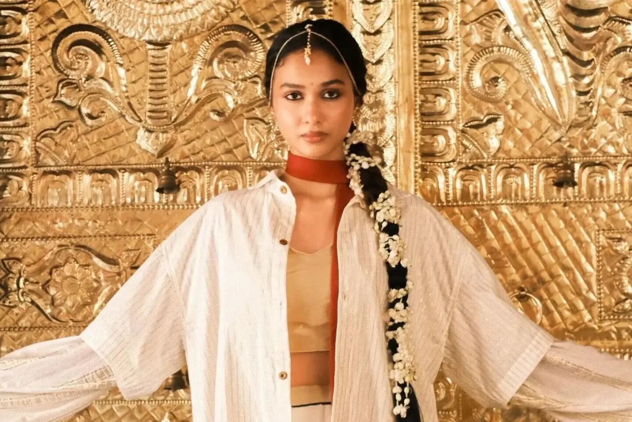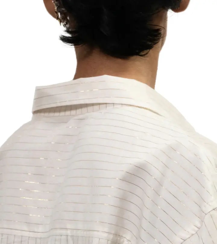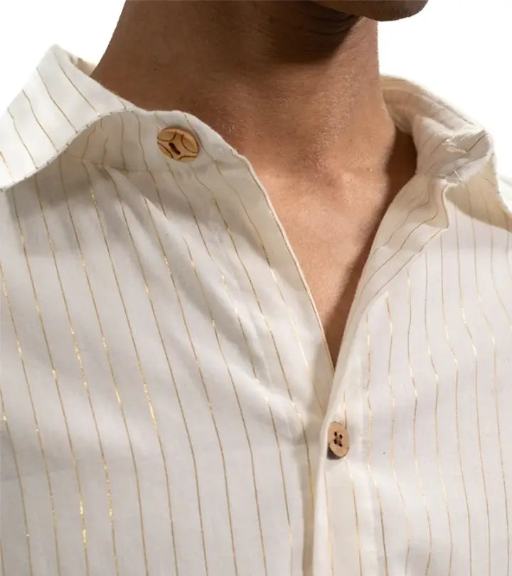 This shirt is part of the KANAKAM – THE FESTIVE EDIT, drawing inspiration from the state of Kerala. The design is inspired by Kasavu, the traditional off-white cotton fabric with gold (Zari) borders native to Kerala. Instead of a traditional border, the design incorporates a modern Zari pinstripe, utilizing the authentic metallic gold thread within the 100% cotton fabric. This technique infuses the garment with the regional heritage of Kerala, creating a festive, elegant piece that is both traditional in inspiration and modern in execution.