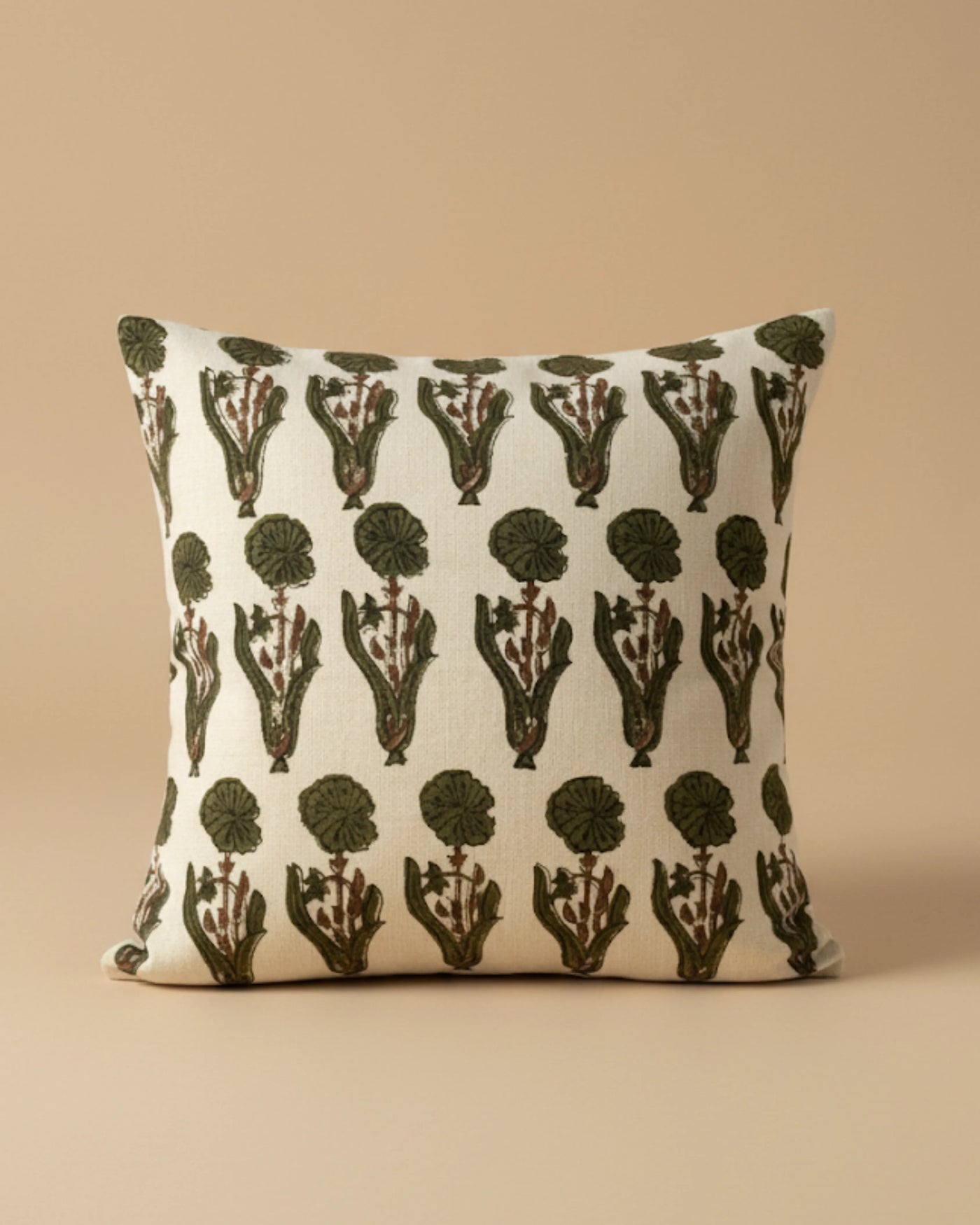 Inspired by the raw, poetic beauty of the wild, Pond of Corbett pays homage to the serene landscapes of Jim Corbett National Park. Crafted using the fading Jahota mud-resist printing tradition, each cushion cover is an intimate dialogue between craft and nature. The earthy colour palette, brown, yellow, olive, and soft beige, evokes the stillness of a forest pond at dusk. Bold desert flower motifs bloom across textured cotton slub, creating a piece that feels both grounded and timeless. Its quiet elegance makes it a seamless fit for Scandinavian-inspired homes, where minimalism embraces warmth and heritage.