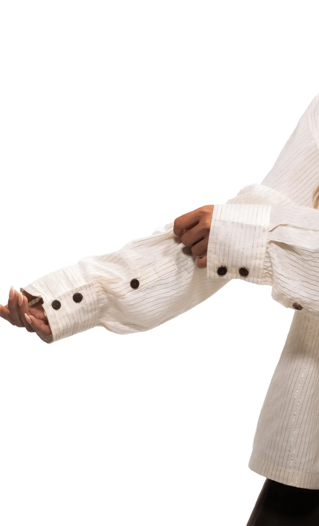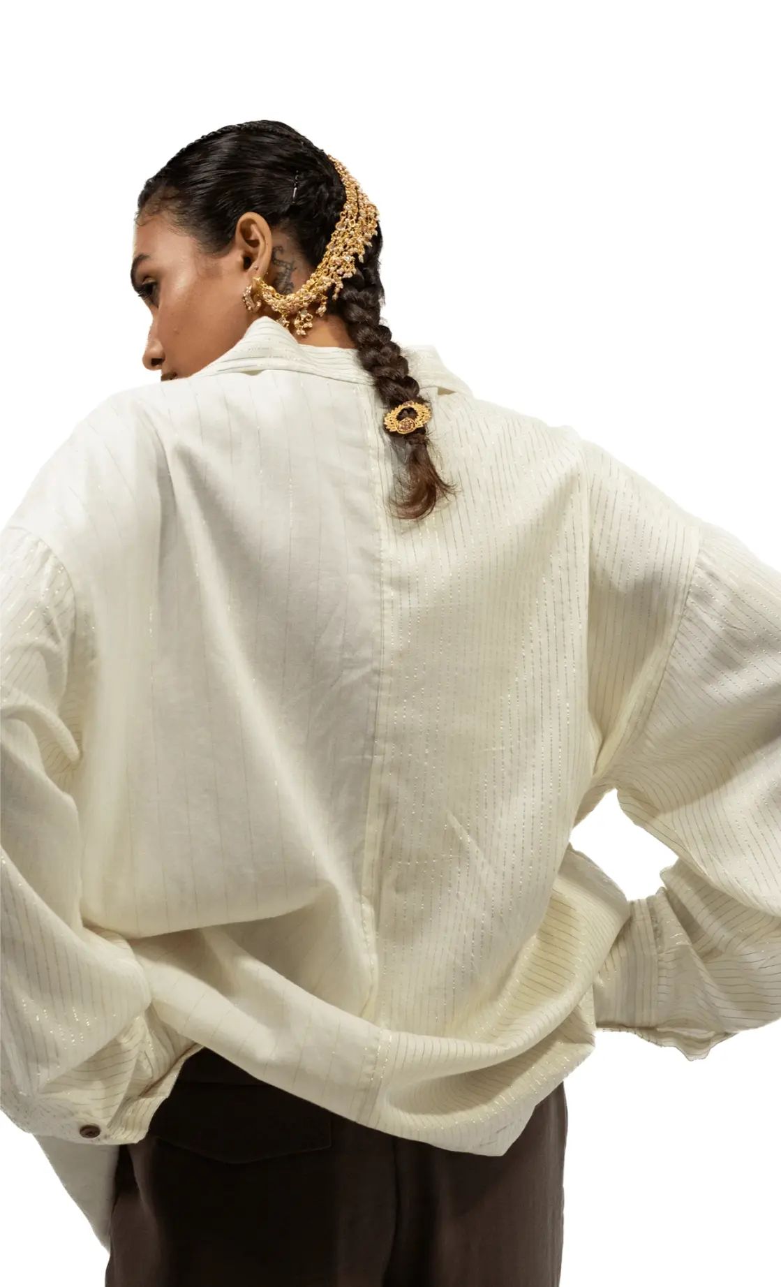A festive edit shirt featuring a Kasavu-inspired Zari weave. The shirt is pinstriped in a unique half-and-half cut. Precision tailoring includes a single-layer lining for perfect weight and fall.