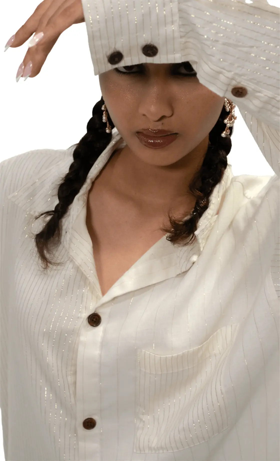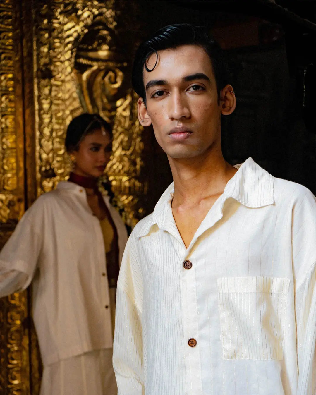 This shirt is part of the KANAKAM – THE FESTIVE EDIT, drawing inspiration from the state of Kerala. The design is inspired by Kasavu, Kerala's iconic traditional textile with shimmering Zari (gold thread) details.