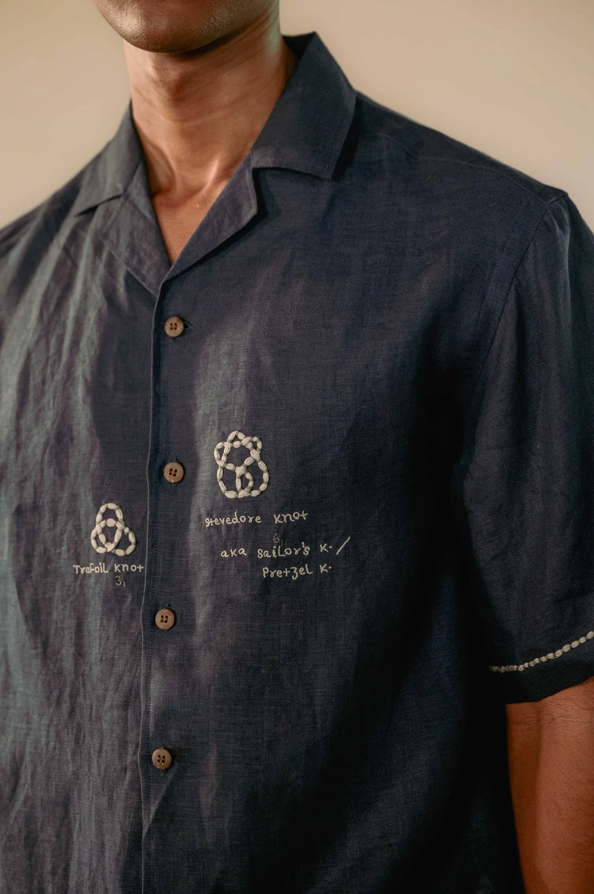 The design celebrates hobbies and the art of focused leisure. The shirt is made from 60 lea European flax-certified Linen and features detailed hand-embroidered knots with their names. Hand embroidery is a universal and ancient craft, dating back thousands of years across cultures, used here to transform the garment into a unique, hand-crafted piece that signifies quality and enduring heritage.