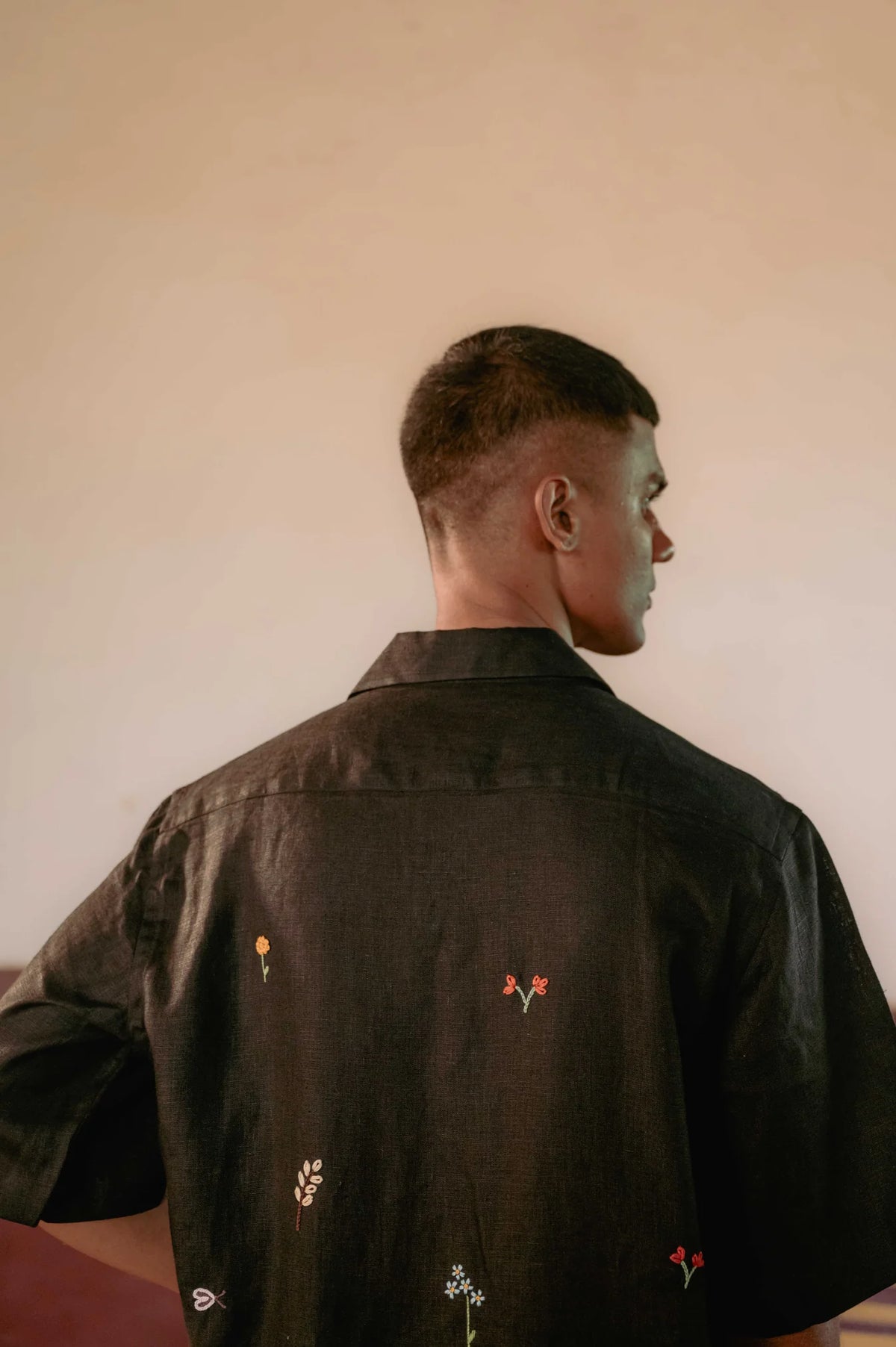 A canvas of black, adorned with scattered flower stalks that grow in no particular order. A shirt that celebrates the beauty of untamed nature, a sprig, a bud, a flower stalk. Detail: Hand-embroidered flower stalks.